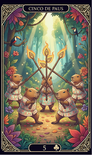 Xiii... tem disputa no ar! O Cinco fala de competição, conflitos e desafios. Mas calma, meu bem — isso pode te fortalecer. A Tia te diz: lute com ética e aprenda com o embate.